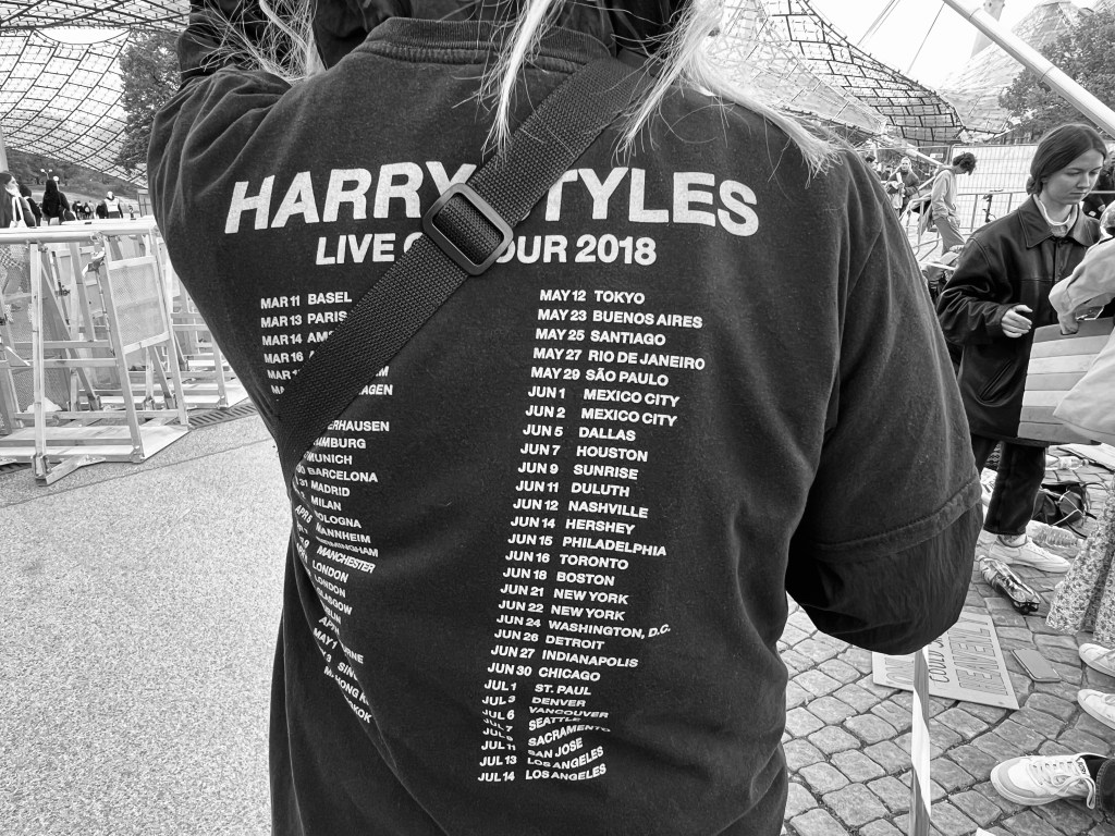But now the wait was more exciting, they gave us the official fabric bracelet for the pod and some guy wrote numbers on our wrists. They told us we could move and come back not later than 1:30pm. So we went for a walk, we bought merch, had something to eat, to drink.. a lot of hot tea was involved as it was still very cold, but then, after a bit, the sun came out and you could suddenly hear all of us scream as if Harry just took over the stage.